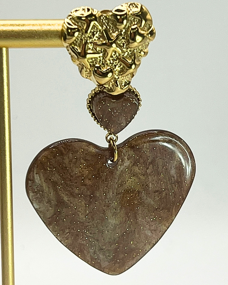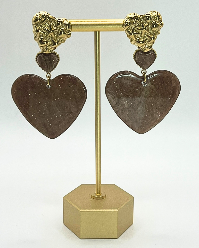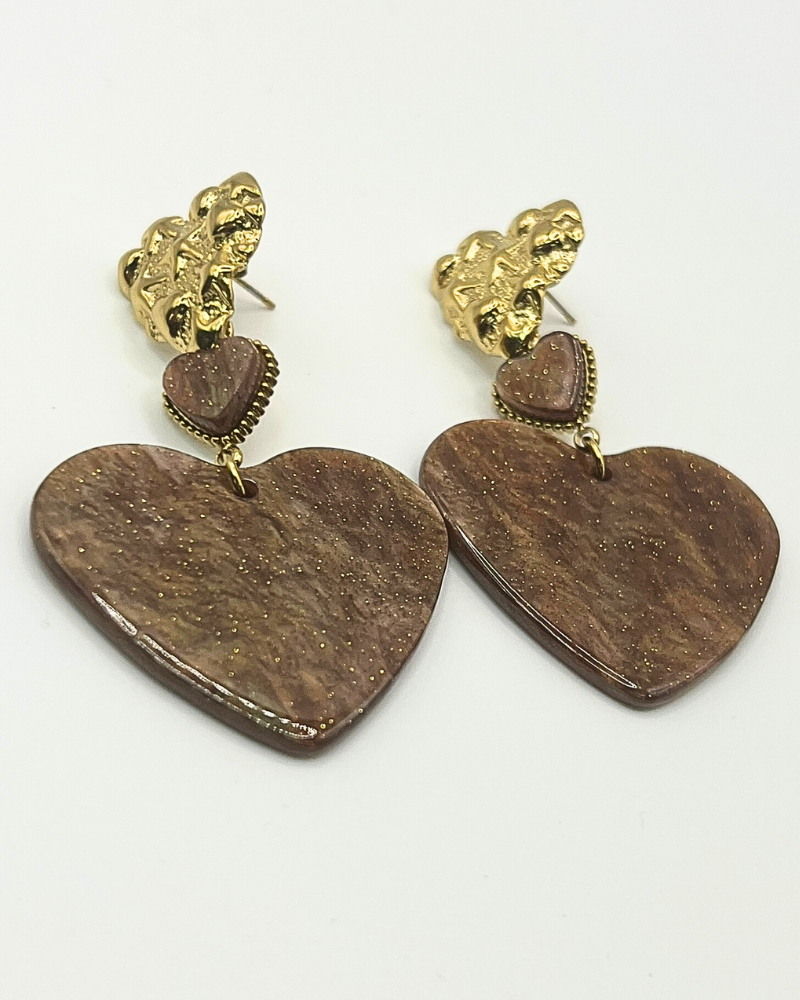 Prachtige statement oorbellen met twee bruine harten met een lichte glinstering een goudkleurige roestvrijstalen hartvormige oorsteker. Met deze oorbellen steel jij echt de show.