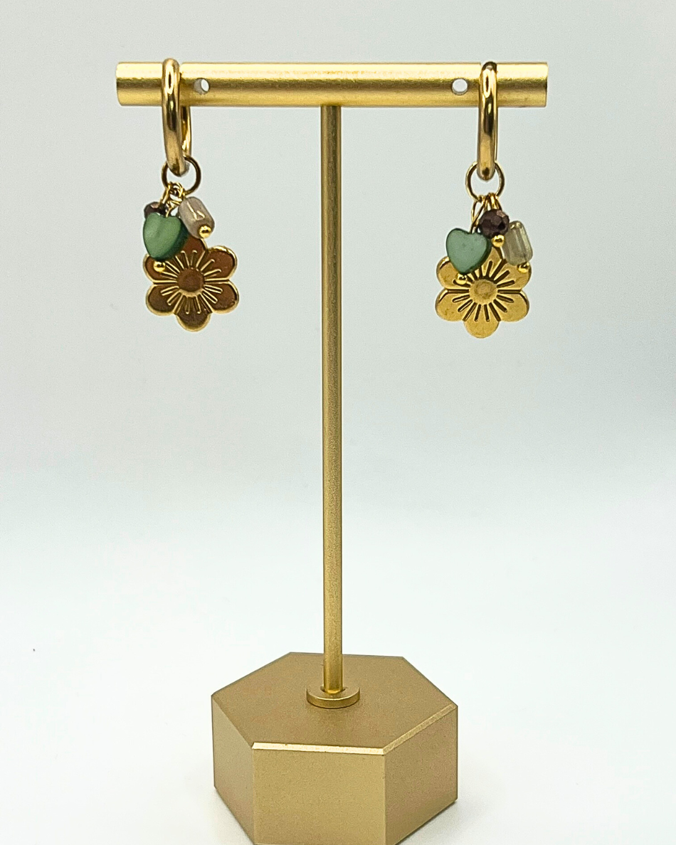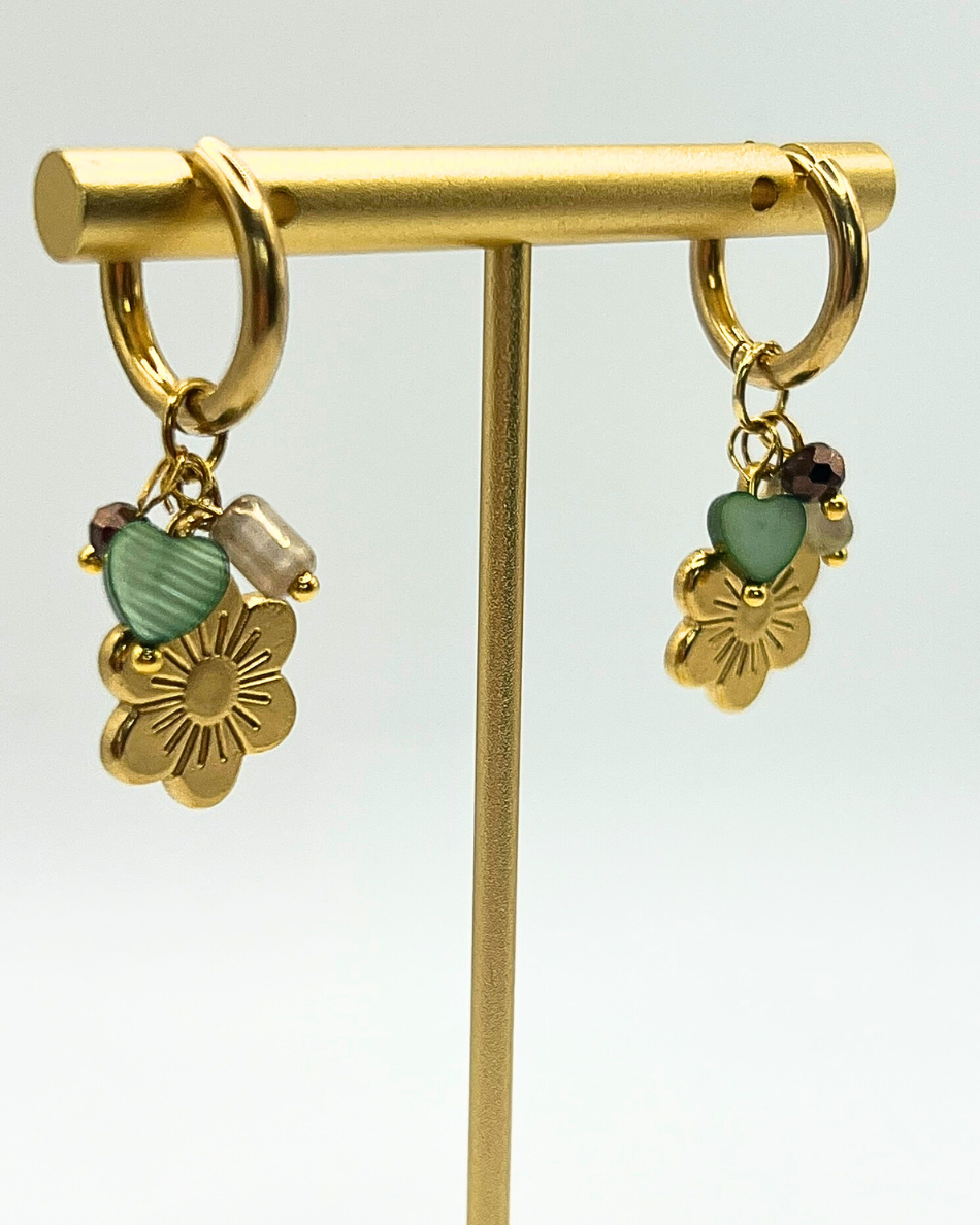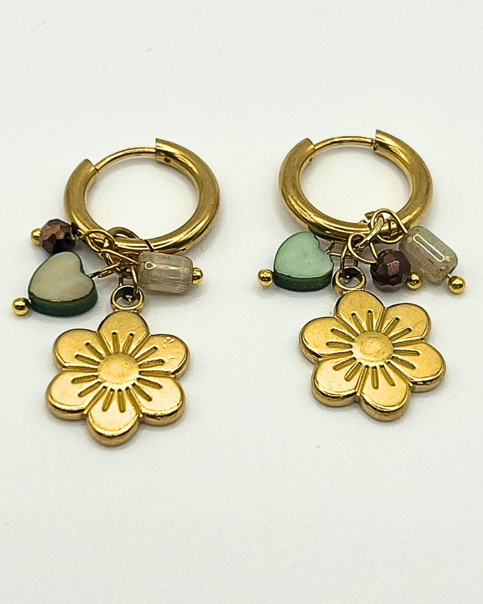 Deze goudkleurige roestvrijstalen oorringen zijn een vrolijke verzameling van charmante bedels. een goudkleurig bloemetje, een groen hartje, een koper kleurig facet geslepen kraaltje en een groenkleurig cilinder kraaltje. Deze 'garden party' hoops brengen instant good vibes.