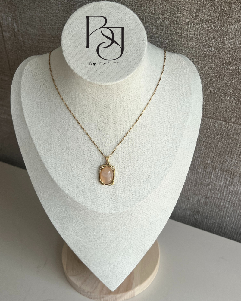 Goudkleurige roestvrijstalen ketting met roze bedel van bergkristal.