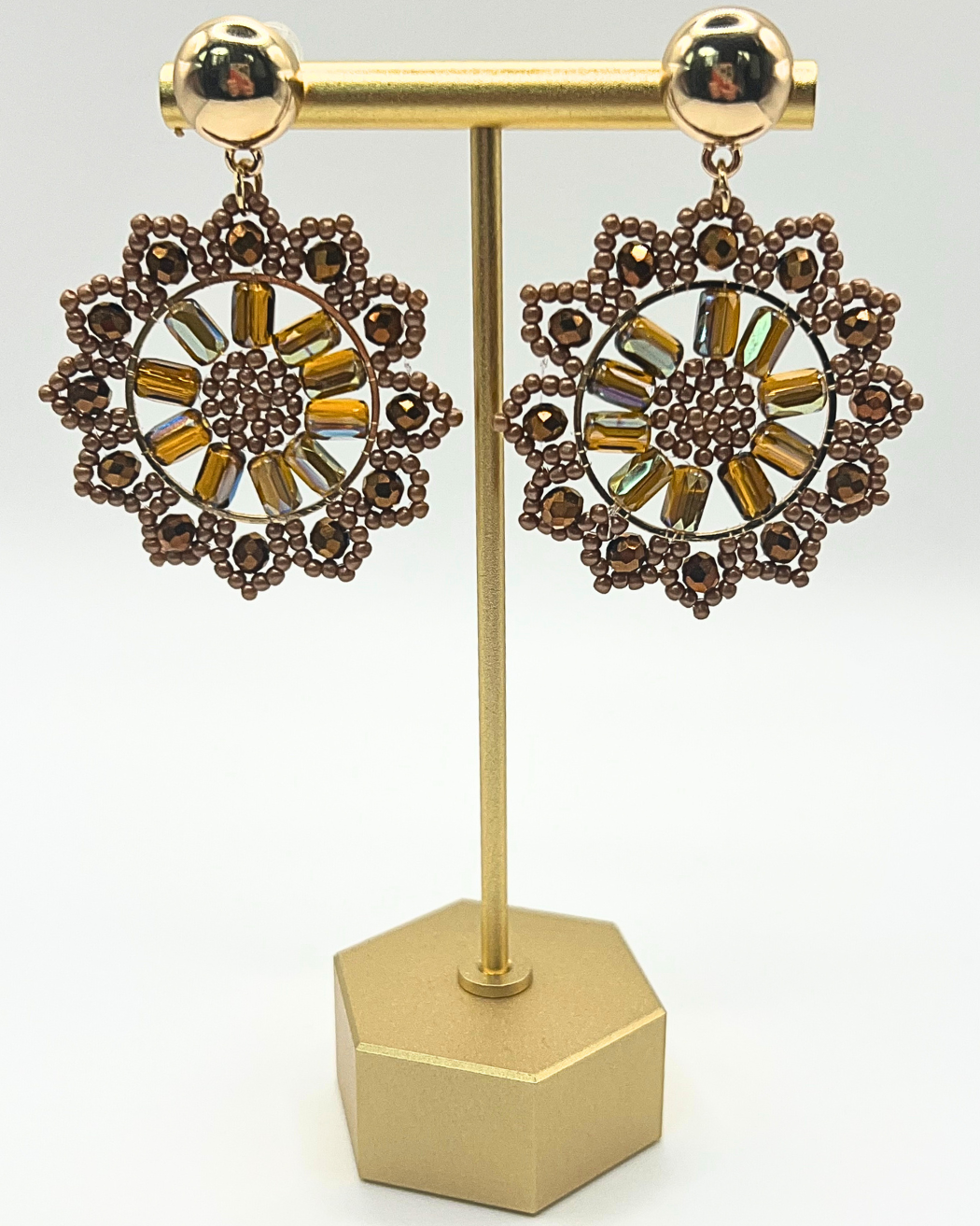 Goudkleurige roestvrijstalen boho mandala oorbellen met kralen in brons, bruin en cognac tinten, perfect voor een koude herfstdag.