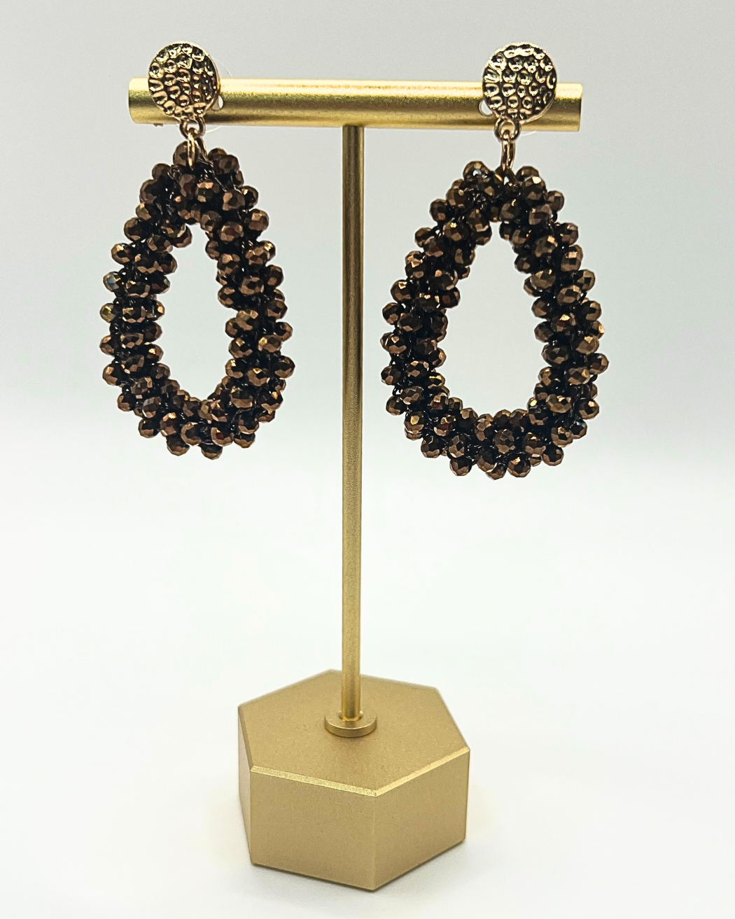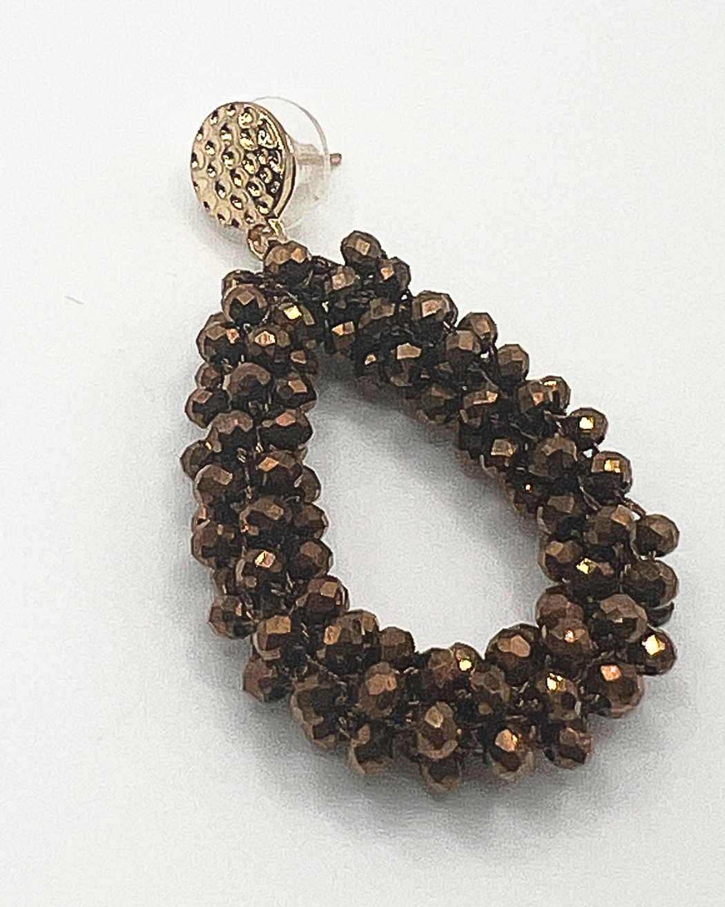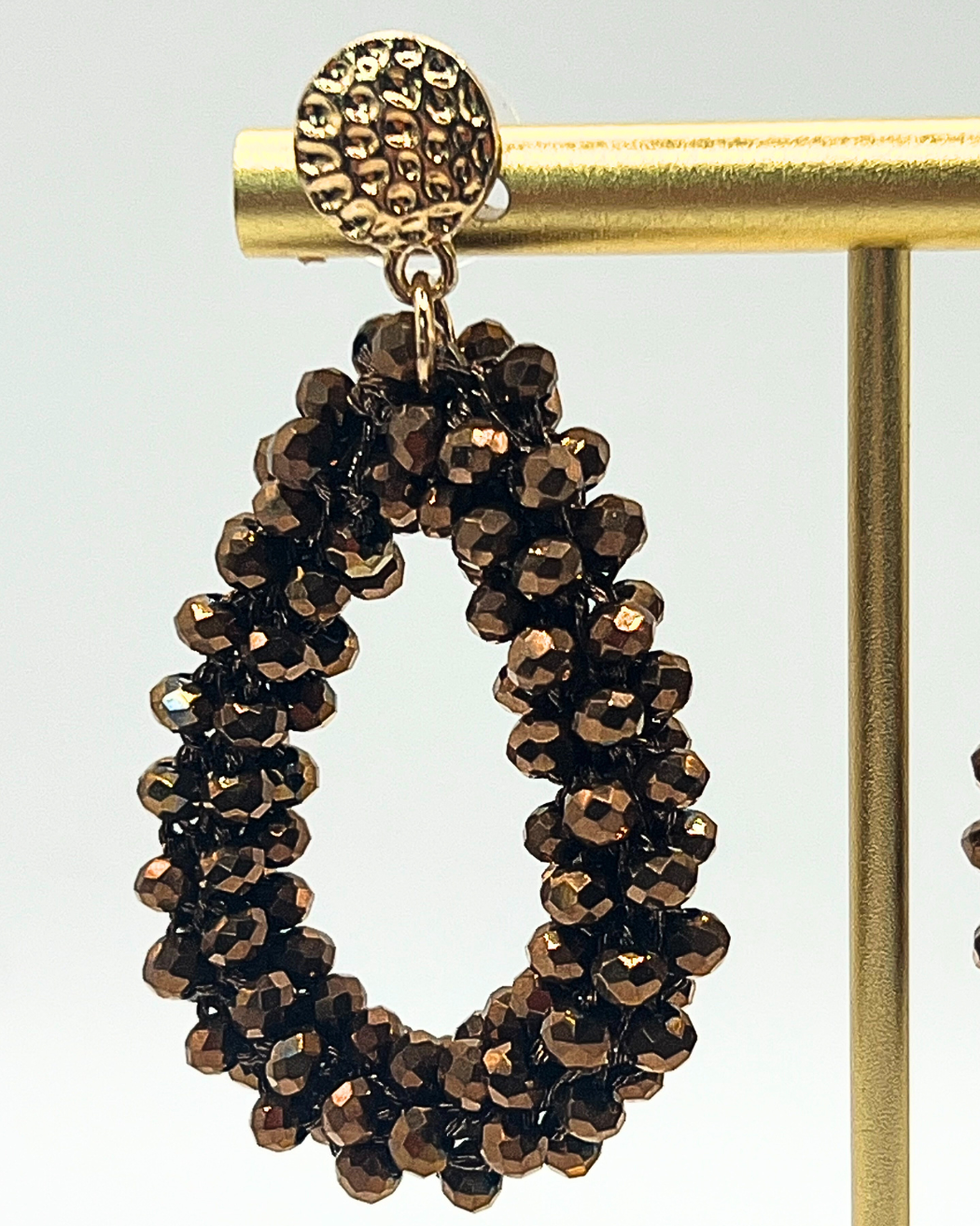 Mooie druppelvormige oorbellen met glinsterende bronskleurige kraaltjes die een luxe en warme uitstraling geven. De goudkleurige stekers hebben een unieke verfijnde textuur. Perfecte afstijler voor je feestoutfit of om je casual outfit een beetje glamour te geven.